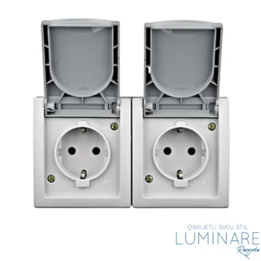 Dvostruka horizontalna utičnica sa poklopcem u sivoj boji je praktično rješenje za spajanje električnih uređaja na otvorenom prostoru.
