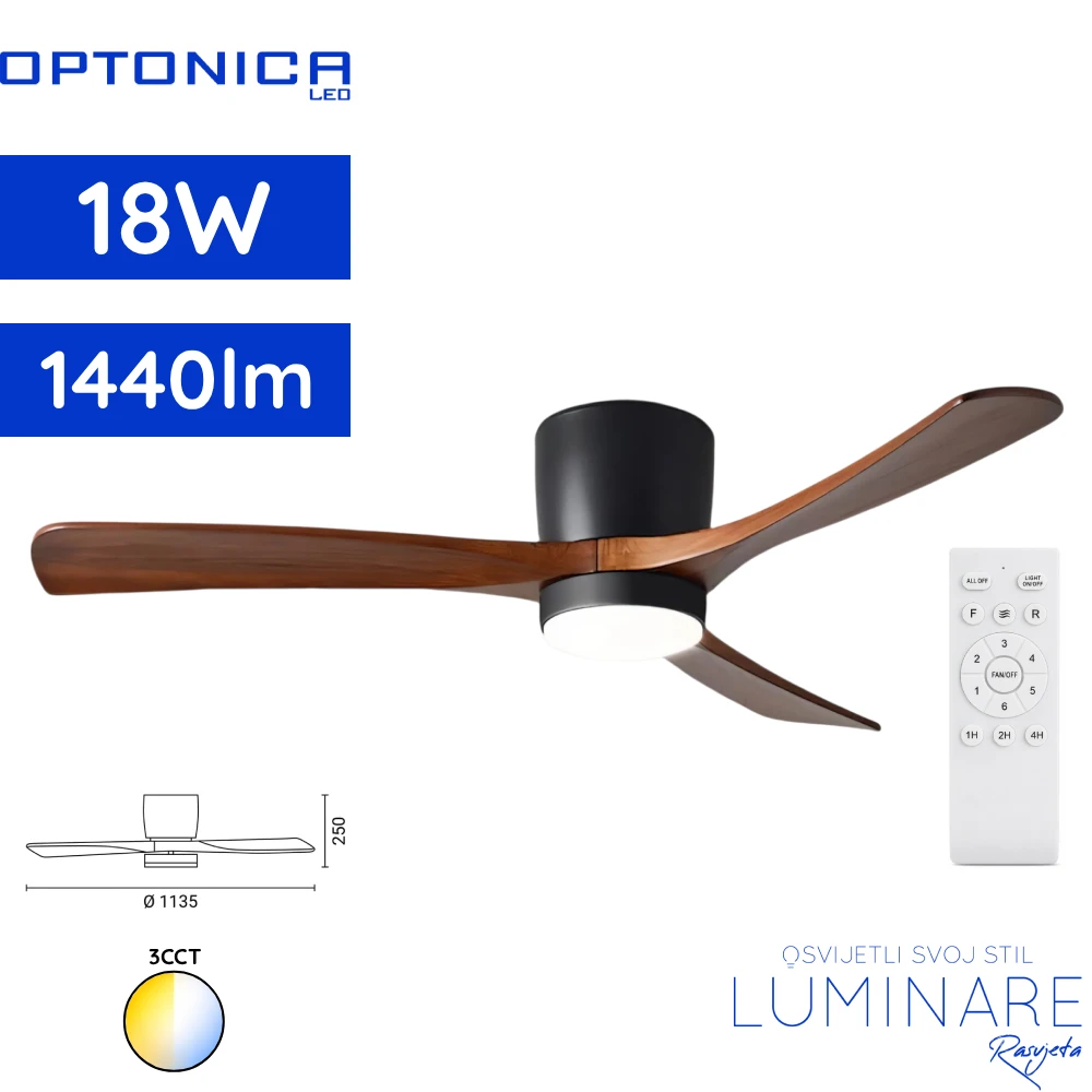 Optonica stropni ventilator s integriranom LED svjetiljkom predstavlja praktično rješenje za rasvjetu i ventilaciju prostora u jednom uređaju. Ovaj moderan ventilator dizajniran je za dnevne boravke, spavaće sobe, urede ili druge unutarnje prostore gdje je potrebno kombinirati učinkovitu rasvjetu i ugodno strujanje zraka.
