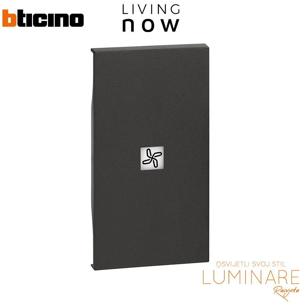 Bticino Living Now 2M tipka s oznakom ventilator u mat crnoj boji (KG01M2RN) donosi elegantan i moderan izgled.