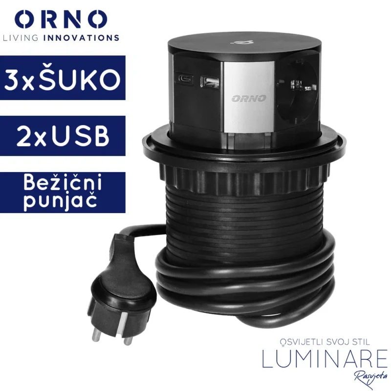 ORNO OR-GM-9017(GS) – Ugradbena utičnica za namještaj s QI bežičnim punjačem, USB priključkom i 3x Schuko izlaza, Ø100 mm, crna