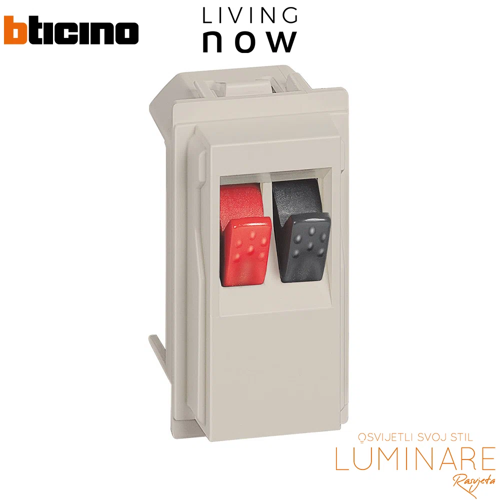 KM4294 je visokokvalitetna zvučnički priključna utičnica iz premium BTicino Living Now serije, namijenjena jednostavnom i sigurnom povezivanju audio sustava unutar modernih stambenih ili poslovnih prostora. Ovaj modul omogućuje čisto i organizirano povezivanje zvučničkih kabela.